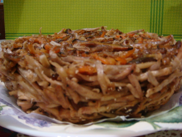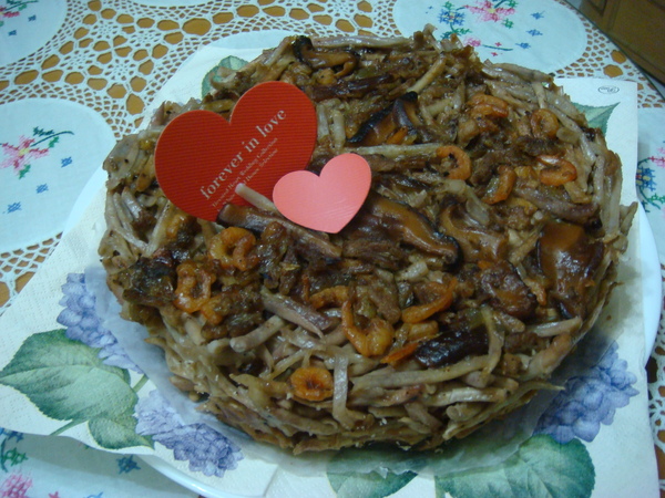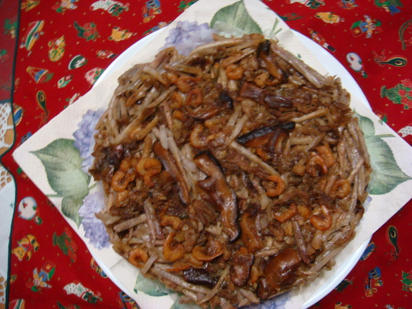 香菇及肉切成絲,與蝦米、紅蔥頭一起爆香,加一點冰糖、胡椒粉,炒成粿的拌料及舖料。