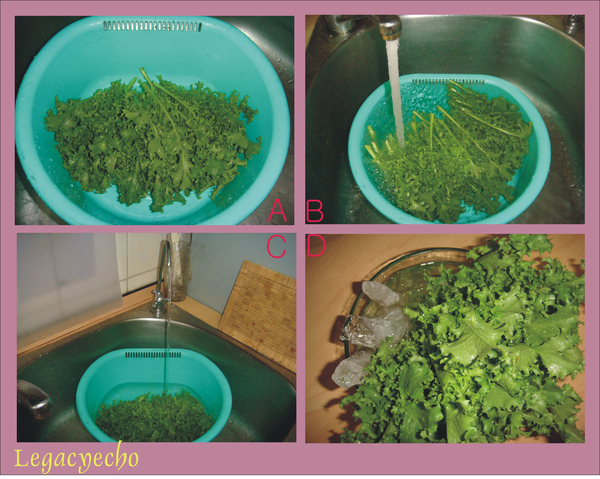 喜歡菊苣除了清脆爽口外,就是纖維攝取的所需。採收下來的菊苣用清水沖洗,葉片有小小蜷曲,因此沖洗可以避免沙土殘留蜷曲的葉中。用冰水浸泡為了增加脆度,延長保鮮效果。