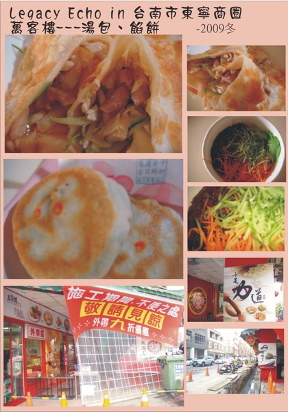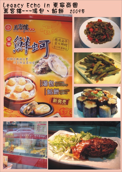 萬客樓主要以麵類製品為主,蔥油餅、抓餅、湯包、餡餅、煎餃,炸醬麵、排骨麵、餛飩湯,各式各樣的小菜...等等。為了健康與美味推出了蔬菜雞絲捲餅,為了增加台南特色,發展了鮮蚵餡餅,餡餅中包入安平外海養殖的鮮蚵,別有滋味。
