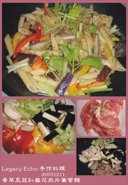 五色蔬菜包括皇帝豆、杏苞菇、茄子、紅黃甜椒、芹菜,雪花肉片以香草鹽醃一下,抓一些太白粉,用一點橄欖油爆香蒜頭先煎一下雪花肉片,依序放入皇帝豆、杏苞菇、茄子,先將煎出香氣的雪花肉片起鍋,免得肉片過老。鍋內入一點水,蓋鍋蓋悶熟皇帝豆、杏苞菇、茄子,這三樣食材軟化之後拌入筆管麵、雪花肉片,勾點薄芡,再放入紅黃甜椒、芹菜,起鍋盛盤。