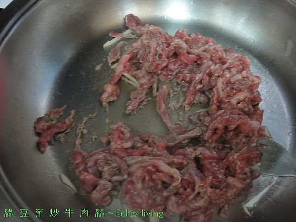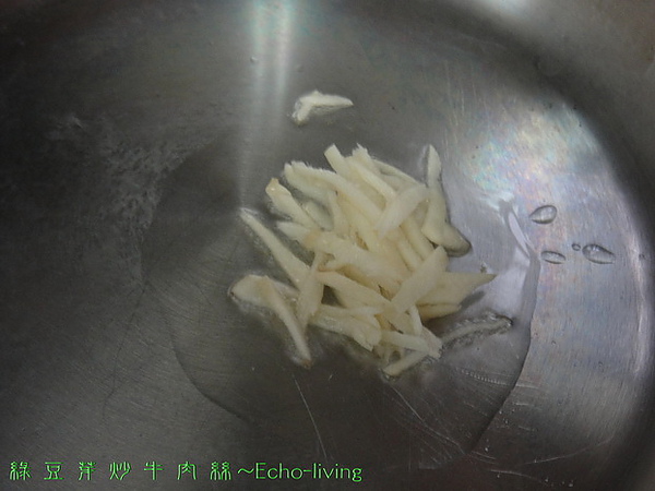 少油爆香薑絲,牛肉絲以醬油、微糖略醃,少量太白粉輕拌,放入鍋中煎出香氣。