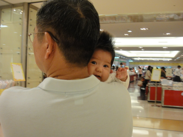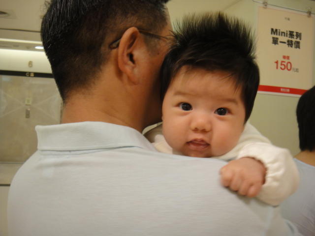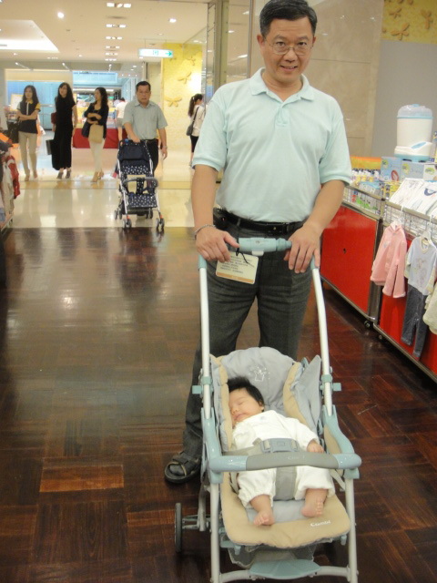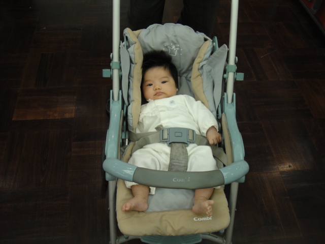亮亮媽媽去服務台借手推車,新光三越的服務很好,根據嬰兒不同的月齡借你最合適的手推車。亮亮坐的這一部是日本的combi,正好和亮亮在家用的手推車同一廠牌。
