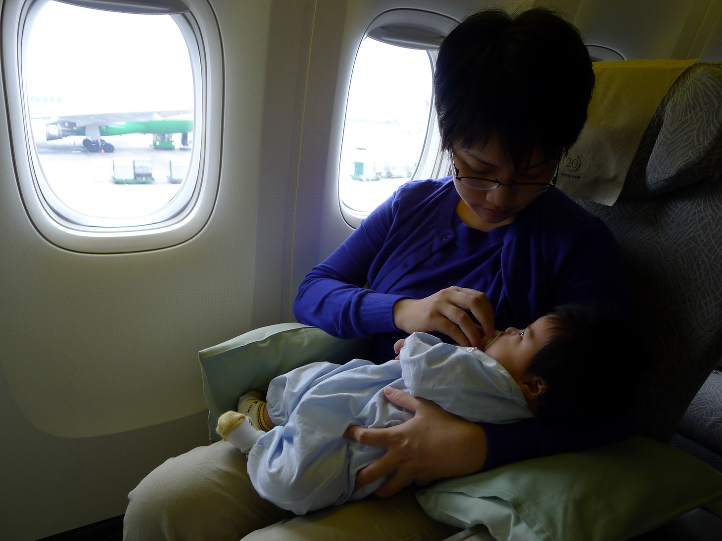 進入機艙,臉上又有些好奇與不安,亮亮媽媽鼓勵亮亮吸吮奶嘴,預防耳壓變化不舒服。