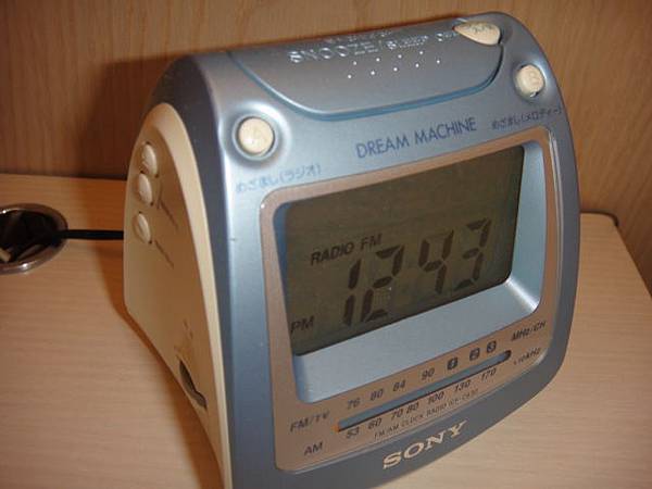 飯店床頭的小時鐘,具有多種功能,除了可做鬧鐘設定外,還附有FM/AM的收音機,小巧可愛。
