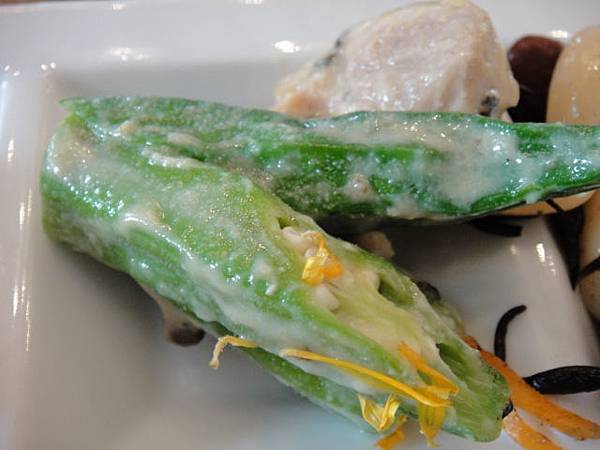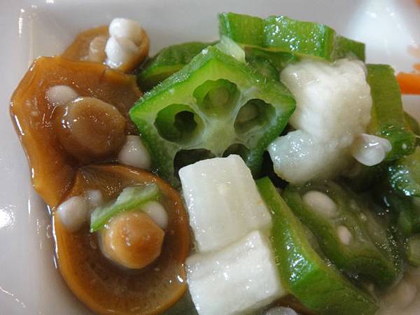 水煮秋葵、鴻喜菇、山藥,這些食材具黏性,有點像勾了芡汁,可以暖胃。