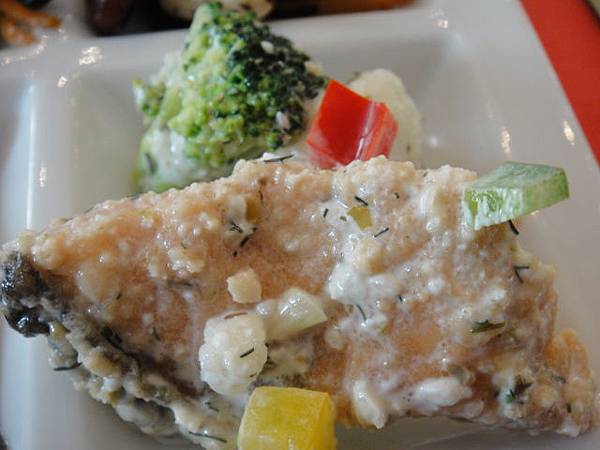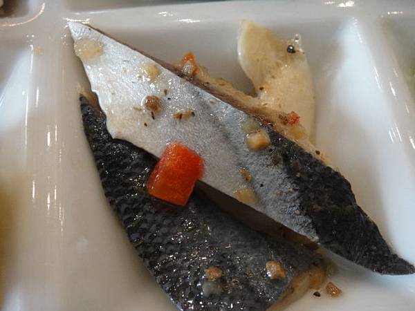 這一盤是JAY選的,左上第一格是秋鮭煨白花椰菜,第二格式鮮蔬醋漬秋刀魚沙拉,中段最右側是香菇紅椒燉豬肉,其下方那一格是草莓煨雞。