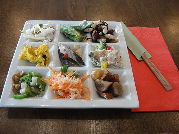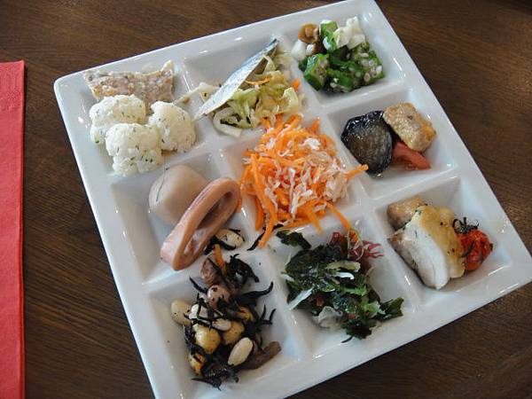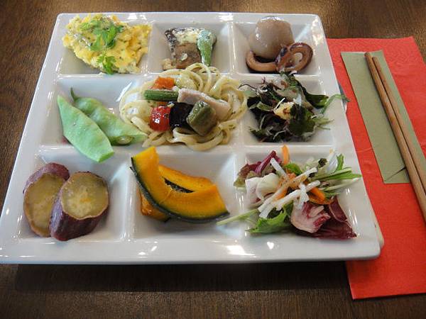 餐盤是九宮格的型態,方便你取用各式料理,味道也不會混合在一起。香草料理主要以當季的食材為主要烹煮材料。