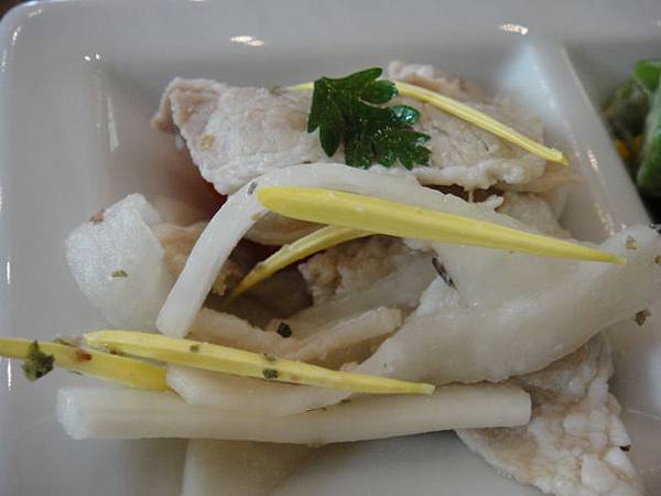 涮梅花豬肉薄片佐以洋蔥、菊花、香菜。