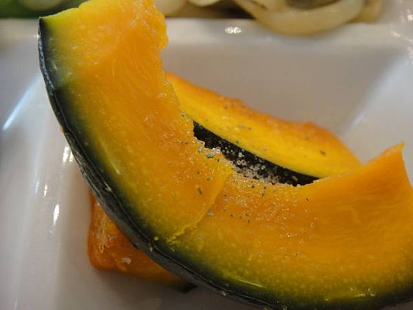 蒸帶皮南瓜,撒上百里香草鹽花,烘托出南瓜的香甜。
