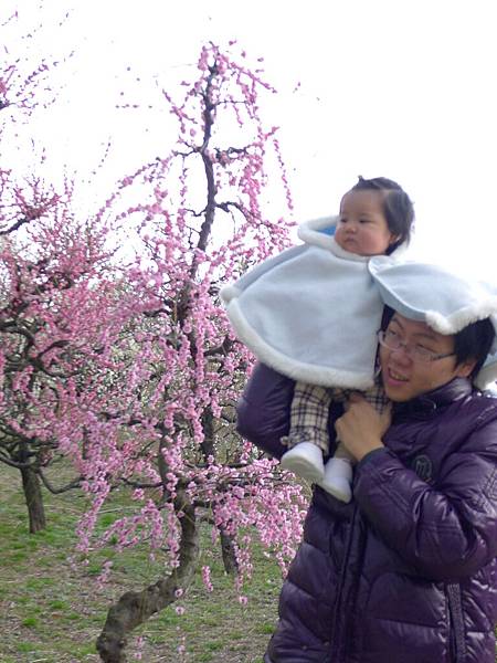 被爸爸扛在肩上的亮亮,看著美麗的梅花,等待著大阪春天的來臨,亮亮將陪著阿嬤拜訪櫻花。