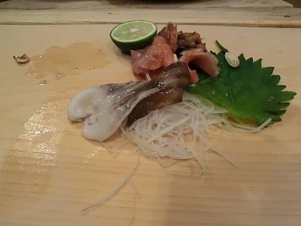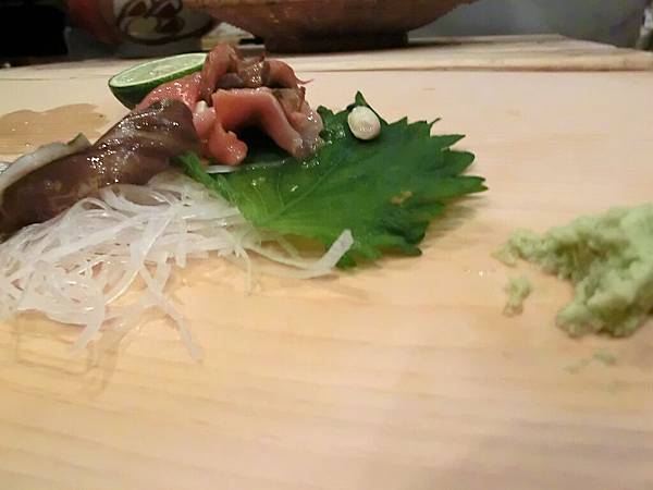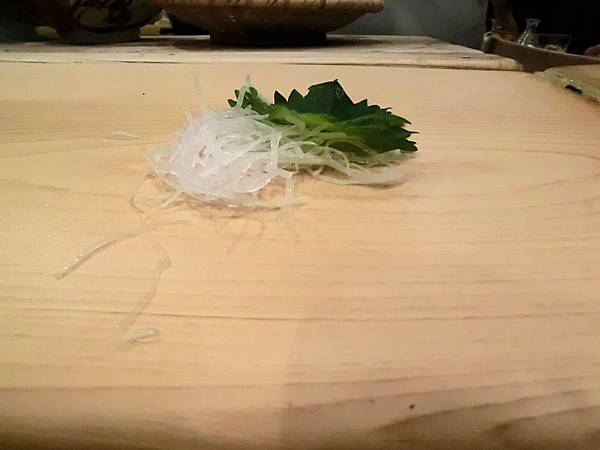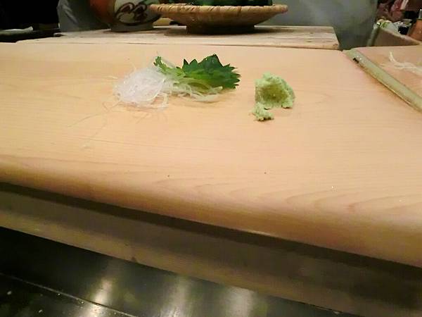 大師傅開始預備我們的料理,板前台上,一片紫蘇,一撮蘿蔔絲,再一撮現磨山葵。