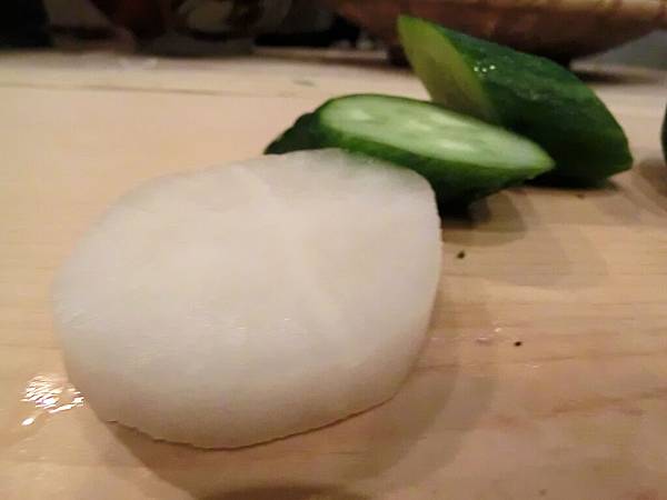 大師傅切了片醋漬蘿蔔、兩片小黃瓜讓我們爽爽口。