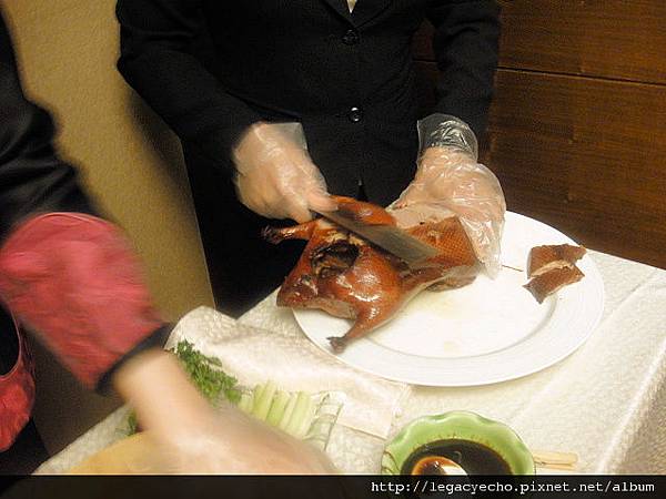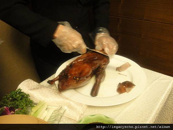 熱騰騰的烤鴨經服務人片開,肉汁四溢,香味撲鼻。