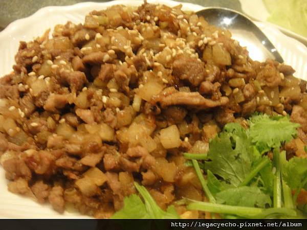 生菜包鴨鬆則是將鴨胸肉和脆筍、荸薺切丁、用XO醬一起炒香,撒上芝麻,再以又新鮮、又爽脆的美生菜夾餡食用。