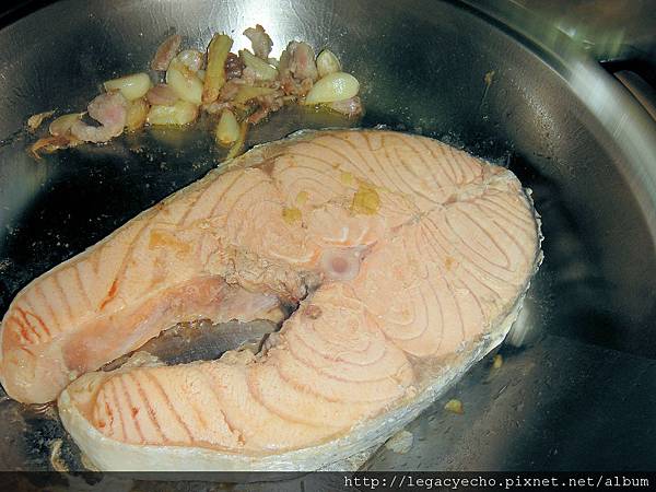 爆香蒜頭與薑,將鮭魚下鍋微煎,導出焦香味。
