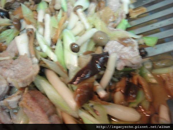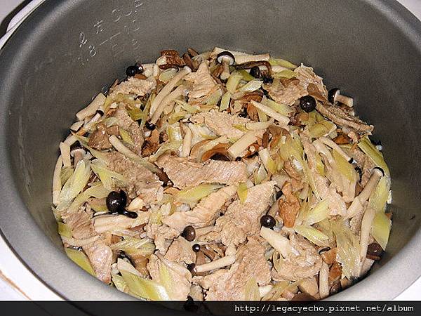 金針筍(金針花莖)切斜片、鴻喜菇炒松坂肉片,岩鹽調味,再與米一起炊煮。