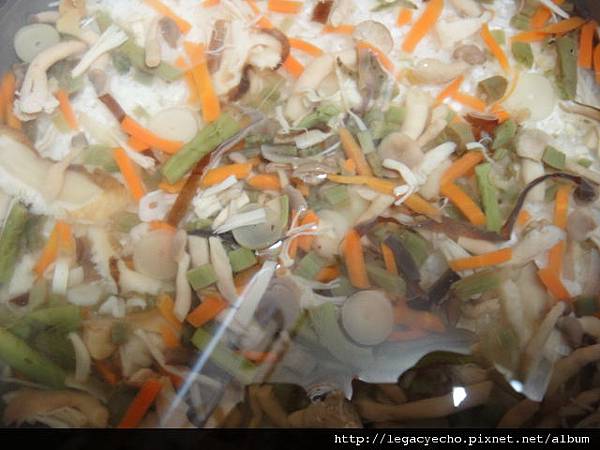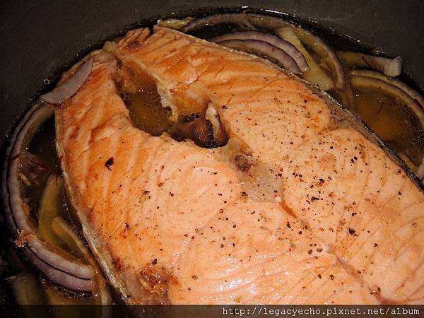 洋蔥切絲置入,再放入微煎的鮭魚一起炊煮。