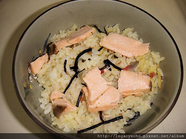 再撕開鮭魚,置於米飯之上,夾入一些醃漬海帶絲,營養美味。