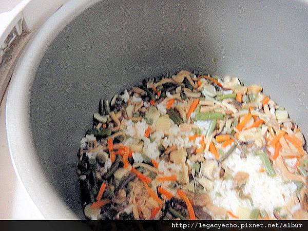 將山菜放入鍋,一起與米炊煮。