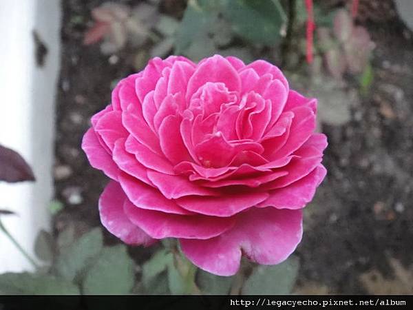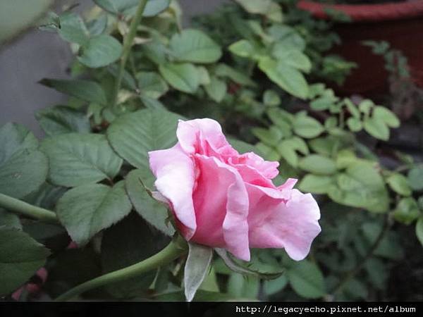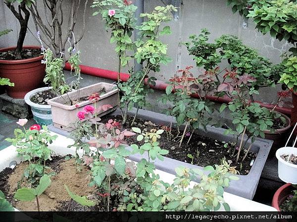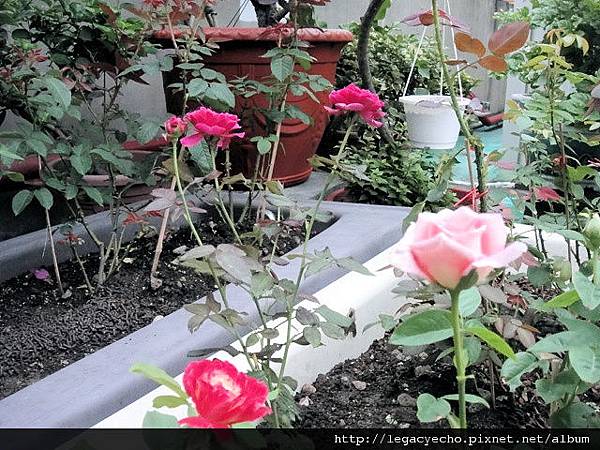 兩個廢棄的大浴缸並列,成一方小角落,種上幾株粉紅色的玫瑰,再加上兩三株紅玫瑰,陽台花園有了玫瑰角落。
