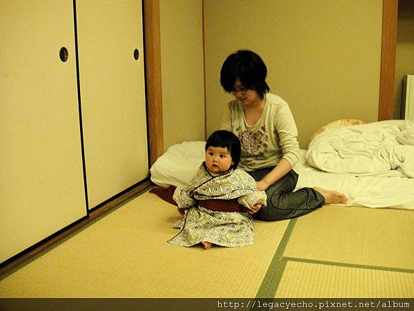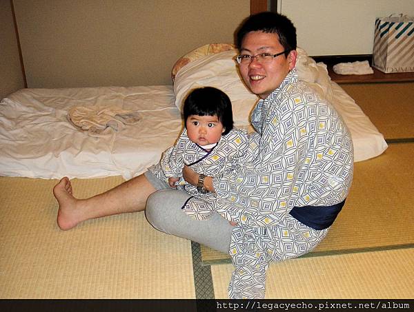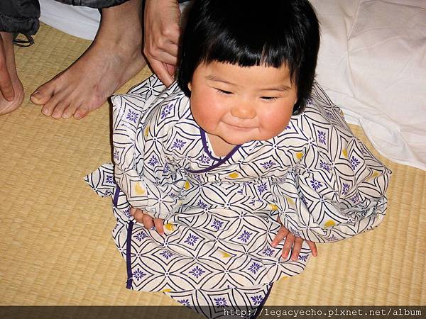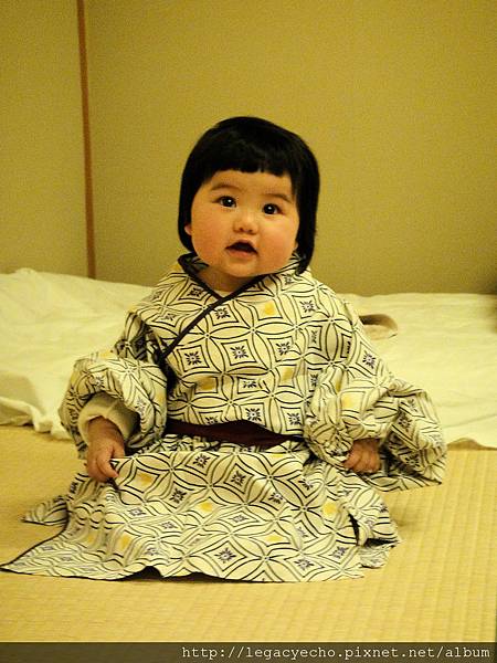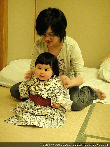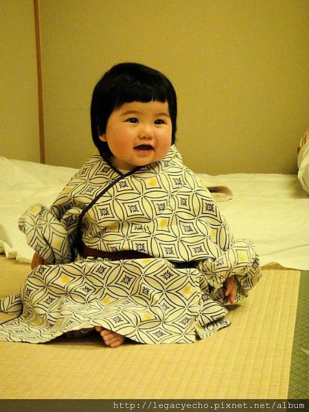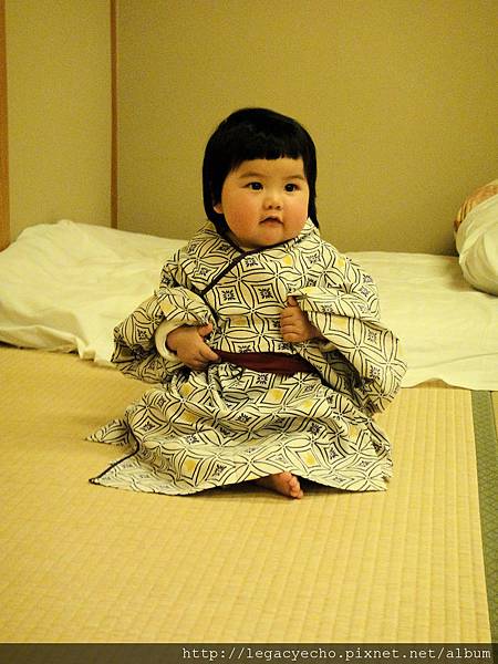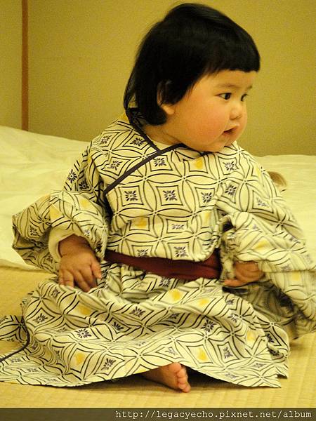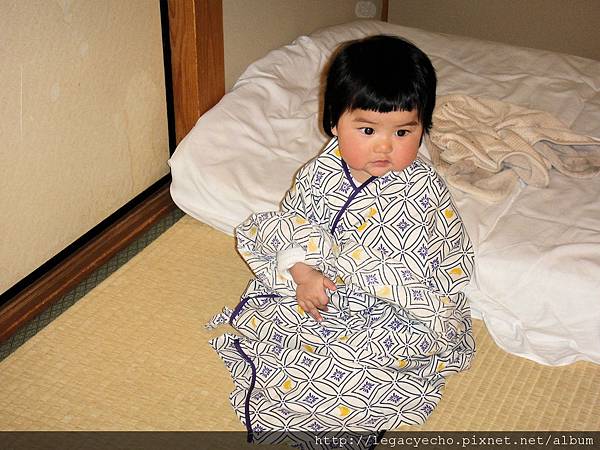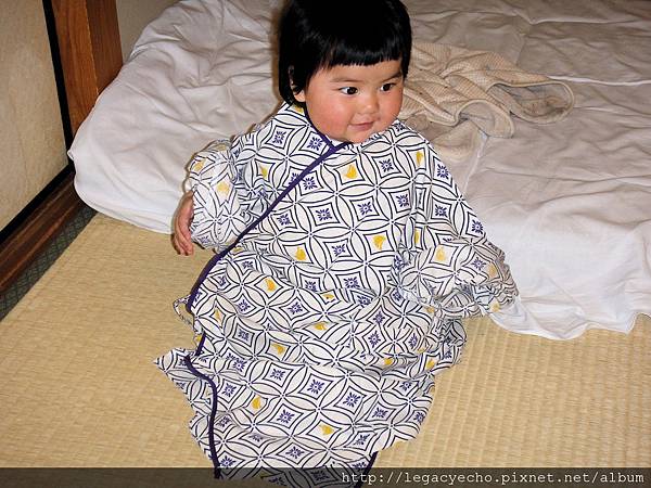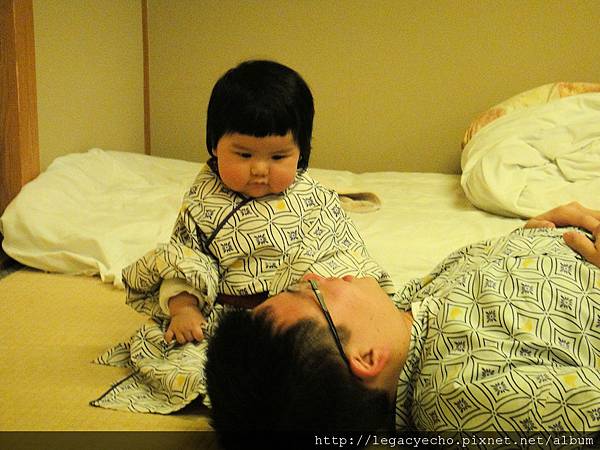 亮亮也好想嘗試一下穿浴衣的感覺,飯店沒有提供浴衣給這麼小的孩子,因此要用點技巧折一下,才幫亮亮換上。