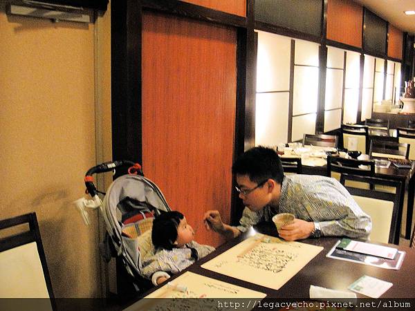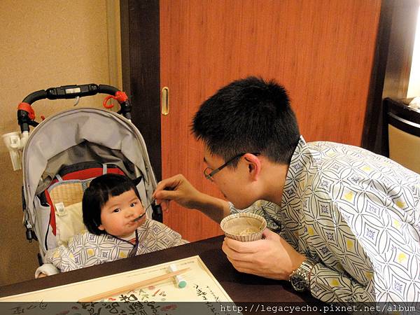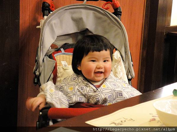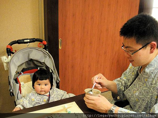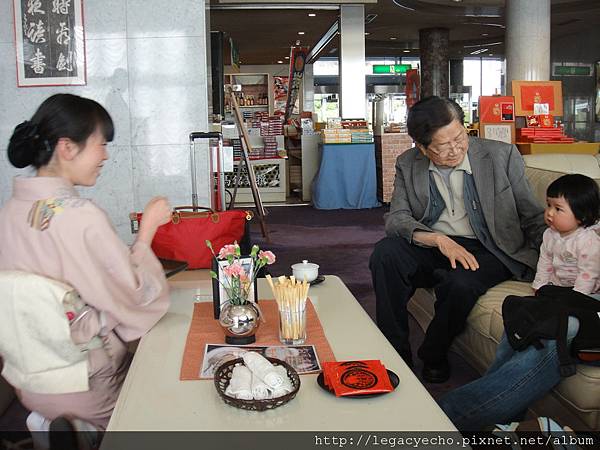 當穿和服的女服務人員為我們送上熱茶及茶點時,亮亮的眼睛盯著這位穿和服的女服務人員打量,我們以為是女服務人員對她微笑,引發亮亮的好奇。