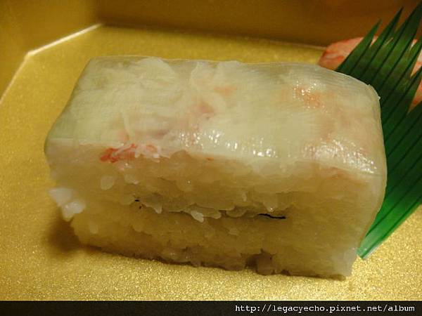 這一貫押壽司,表面是透明的白昆布,裡面是蟹肉,壽司飯的中間夾著一片海苔。