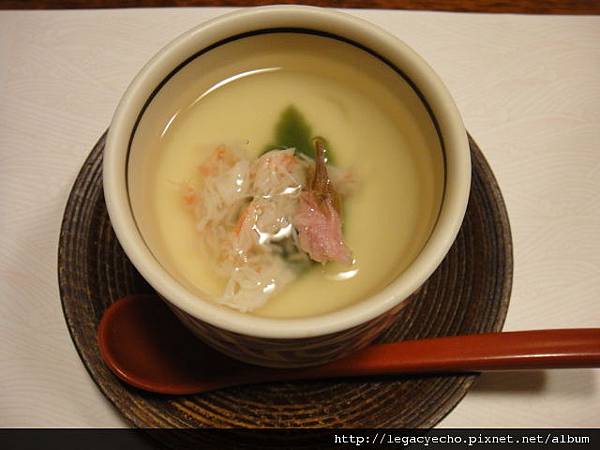 以蟹足高湯及蟹肉絲蒸蛋並綴以櫻花