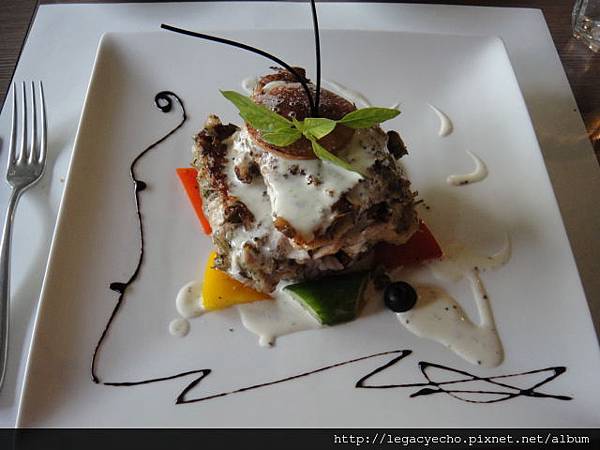 鵝肝嫩雞佐芥菜子醬汁,嫩雞以香草醃製後再燒烤,雞肉的嫩度及香氣相當具水準,鵝肝的濃郁則不如預期。