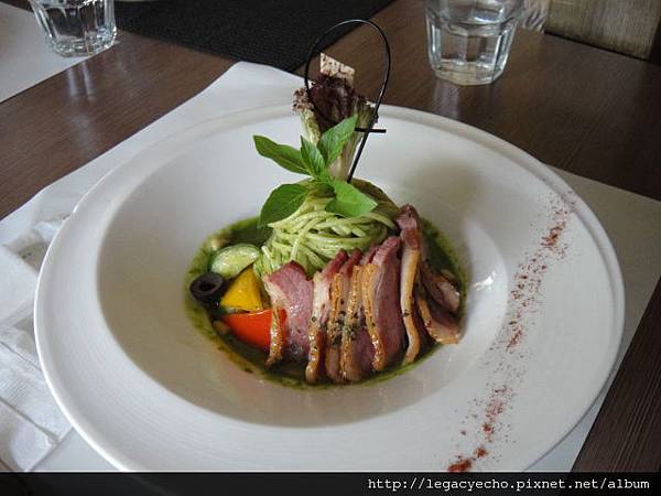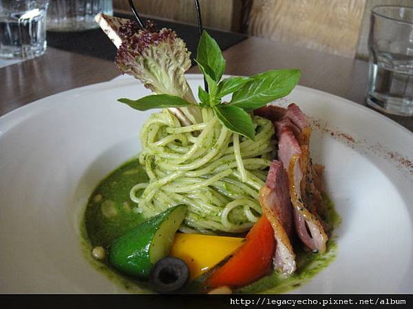 青醬煙燻鴨胸義大利麵,鴨胸的滋味道地,青醬也做得很好。