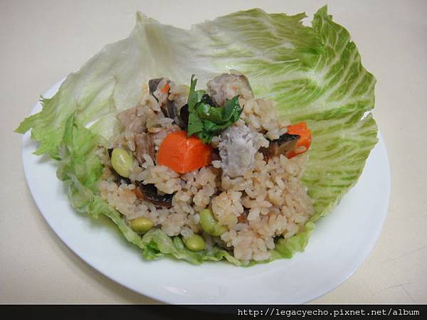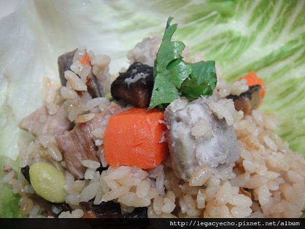 將香芋飯盛放在萵苣葉上,再放上一點香菜提香。