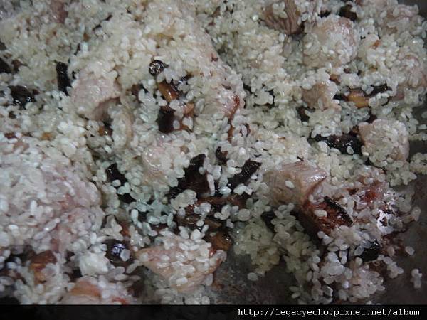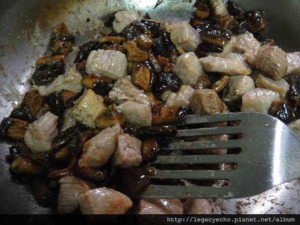 香菇切丁,雪花肉切成骰子狀,少油熱鍋爆香香菇丁,再加入雪花肉炒香,由鍋邊淋入少許醬油,讓醬油在鍋邊煸出鍋氣,這會讓香芋飯更有味道。