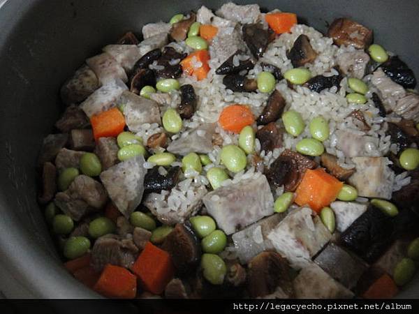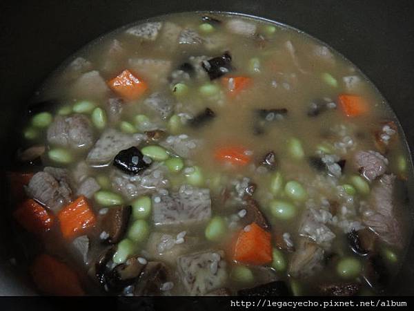 放入紅蘿蔔丁及毛豆,適量的水,用電子鍋烹煮。