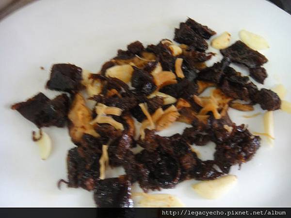 盤底幾粒蒜頭切片、一朵大香菇切絲、一粒干貝剝絲,再加上醬漬明太子昆布。