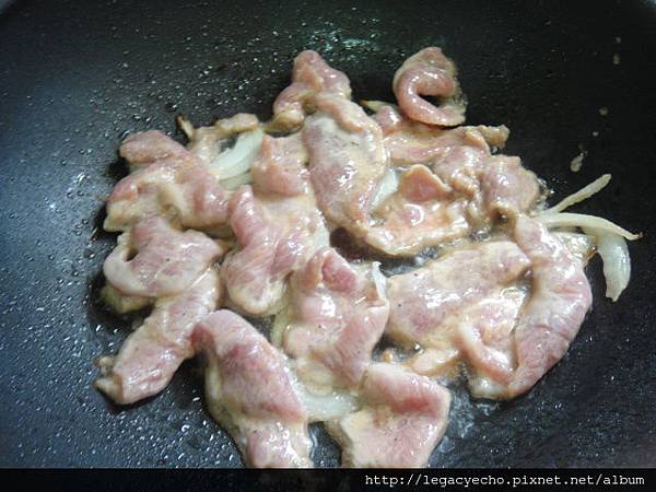 鍋燒熱爆香洋蔥絲,松坂肉平鋪於洋蔥上煎,迅速翻面,見松坂肉已七分熟,放入備好綠花椰菜,配色用紅蘿蔔花片,拌炒均勻。