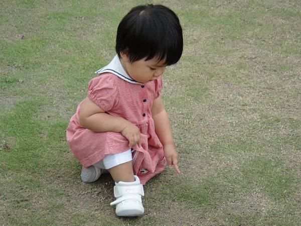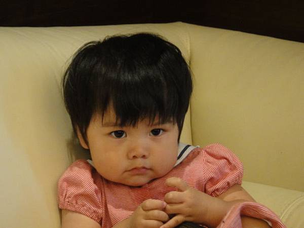 亮亮玩自己的手,玩阿嬤相機套子,一面觀察大家。