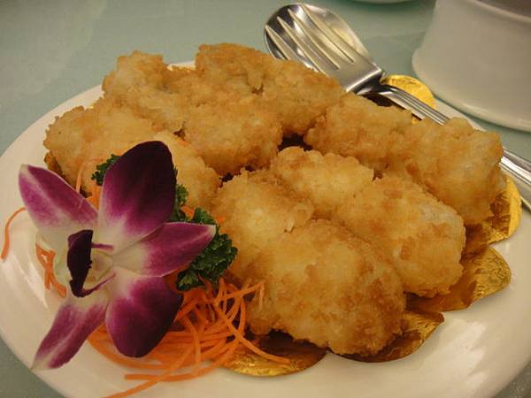 芋泥香檳排,將芋泥油炸成圓圈狀,中間圈住橙汁子排,子排嫩,芋泥香酥,大家都稱讚!