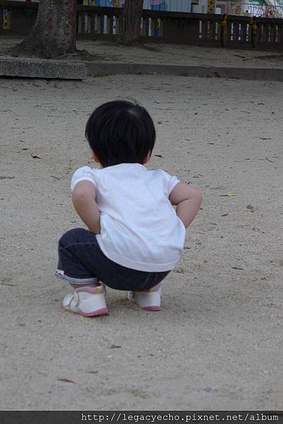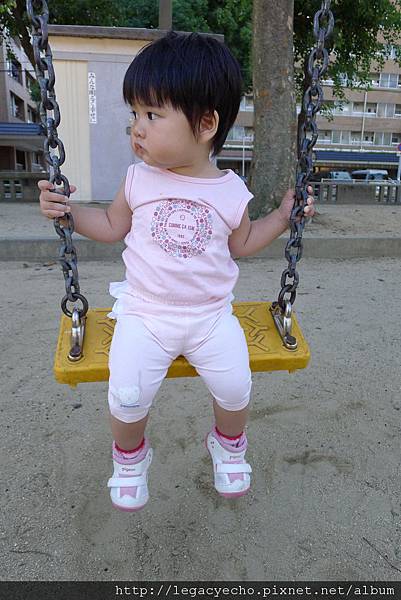 已經可以自己盪鞦韆了,也喜歡靠著欄杆看別的小朋友遊戲。