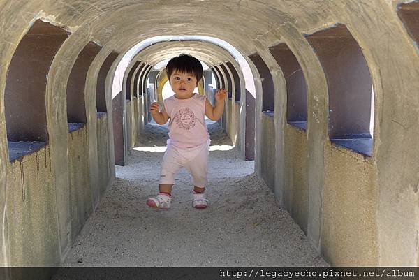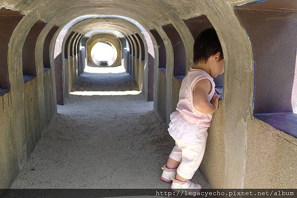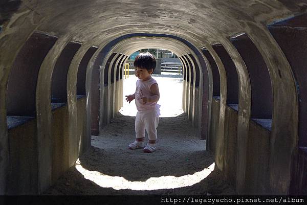 公園裡設計了小朋友的遊戲坑道,坑道裡有採光的孔窗。