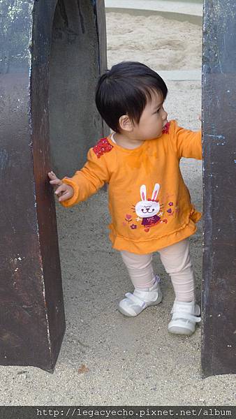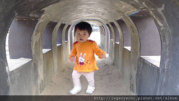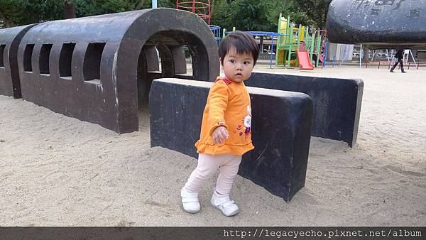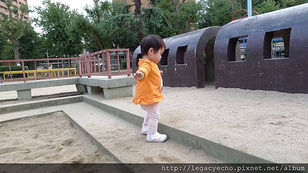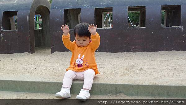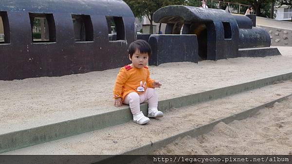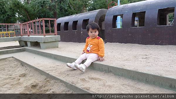坐在沙坑的台階上玩沙最開心,坑道像是一列埋在沙堆的火車。