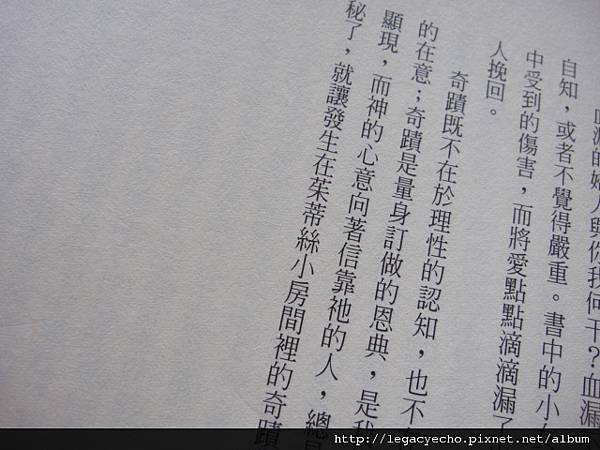 書中有段話,奇蹟既不在於理性的認知,也不在於道德意願,而在於感受到上帝的同在,感受到上帝的在意;奇蹟是量身訂做的恩典,是我們所求所想,但我們永遠別忘了,奇蹟是 神的心意顯現,而 神的心意是向著信靠祂的人,總是美善的。