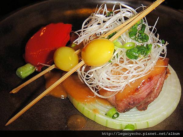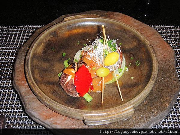 烤物是松阪豬肉,味道與擺盤是本套餐中我覺得最佳表現。竹籤銀杏,四季豆成樹枝,紅椒成葉,雪白蔥絲綴以綠蔥末,細膩中見雅致。