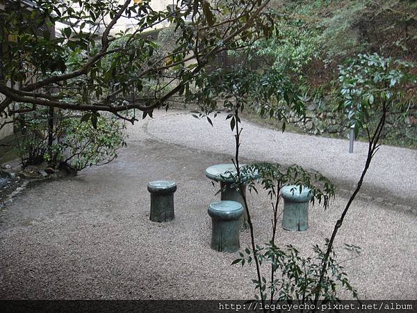 日式房型不鼓勵吸菸,在簷廊上一組木製座椅所附的茶几上,還是放了一個漂亮的煙灰缸。