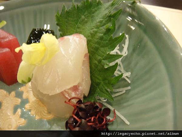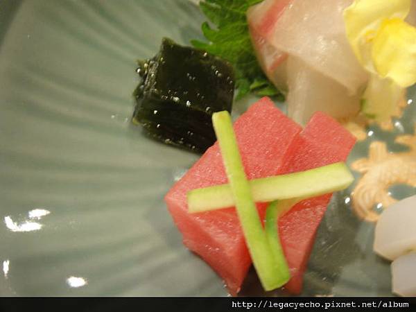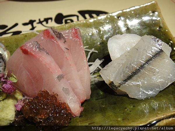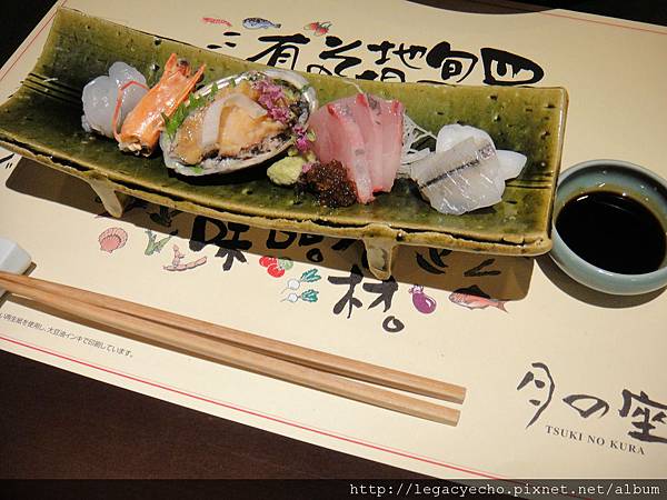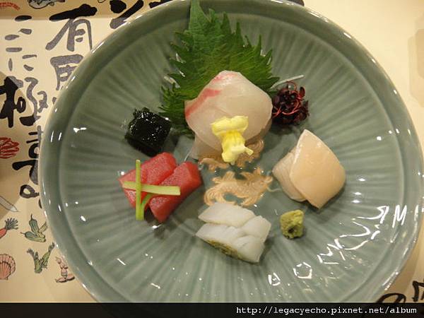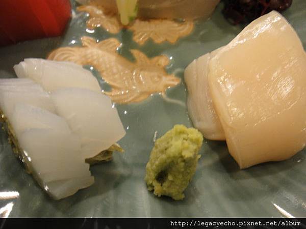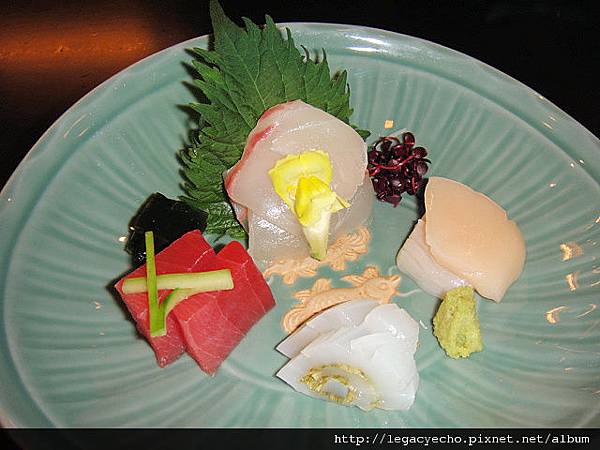 第一個晚上的生魚片料理,使用圓形菊花游魚盤,鮪魚中腹、花枝卷金箔、生干貝、明石鯛,佐以現磨生山葵,精緻且新鮮。