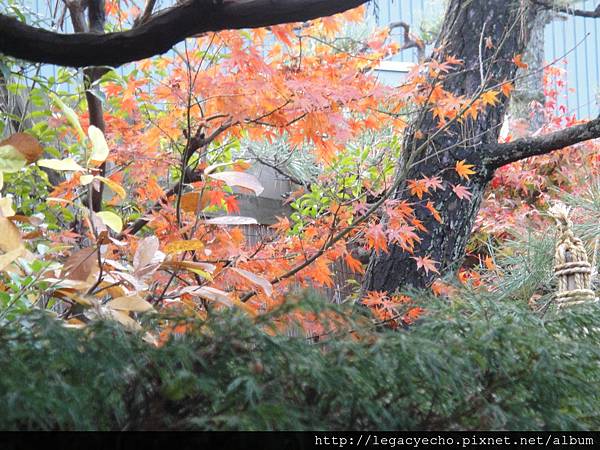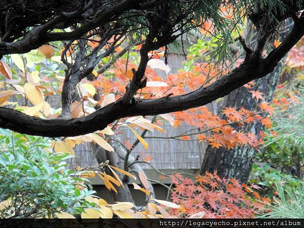 在老松的枝枒間,陽光為片片綠楓上了漸層的紅妝,隱約之間,含蓄委婉道來季節的移轉。