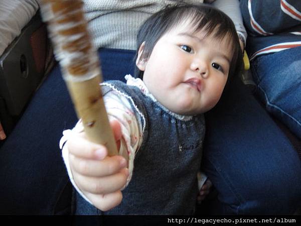 亮亮一心等著拿竹輪中間的竹棒當鼓槌敲著玩。