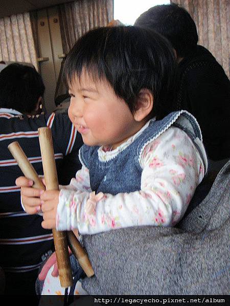 舅公將洗好的竹輪棒子給亮亮當鼓槌打拍子唱歌,亮亮好開心。