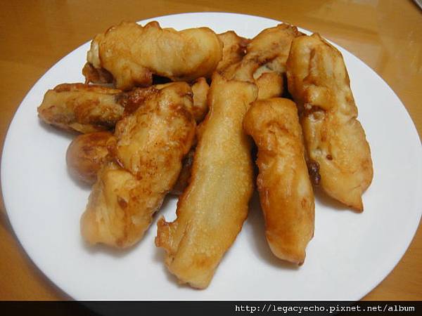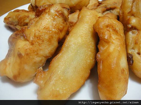這是直接裹濕麵糊油炸,表面光滑一些,也很有味道。