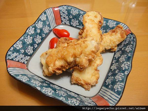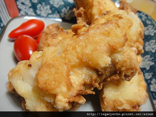 這是沾裹薄薄一層濕麵糊後,再沾一些乾太白粉炸成的,麵衣表皮較不光滑,但是麵衣酥脆度略高。