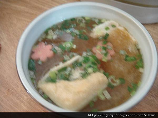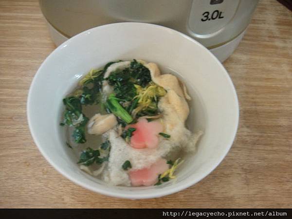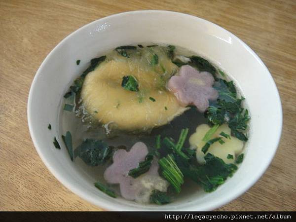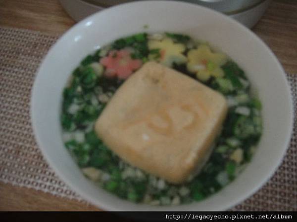 麩皮蔥花魚板湯,魚板如花,飄在湯汁上。